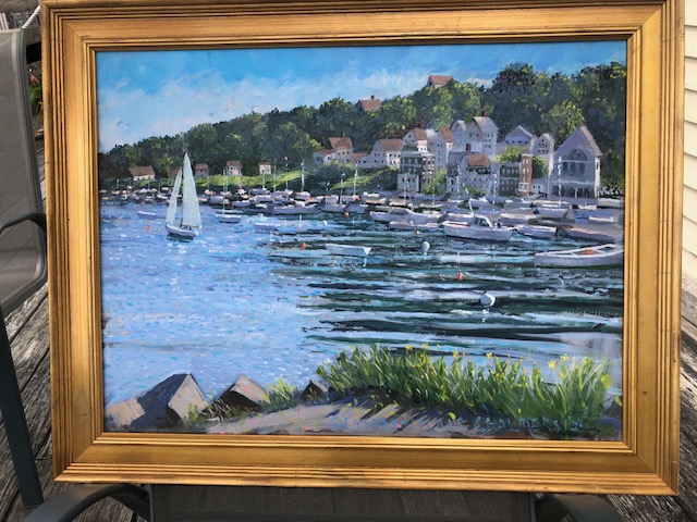 The picture is an 18 X 24 oil on canvas painting of a corner of Gloucester harbor in the morning light. A sailboat has just left her mooring and picks up speed as she catches the morning breeze.